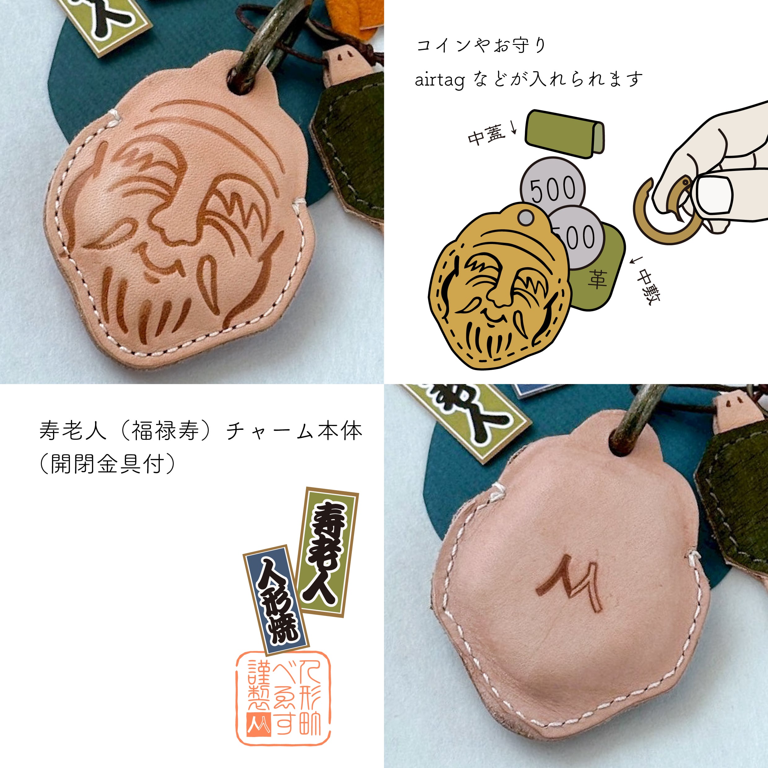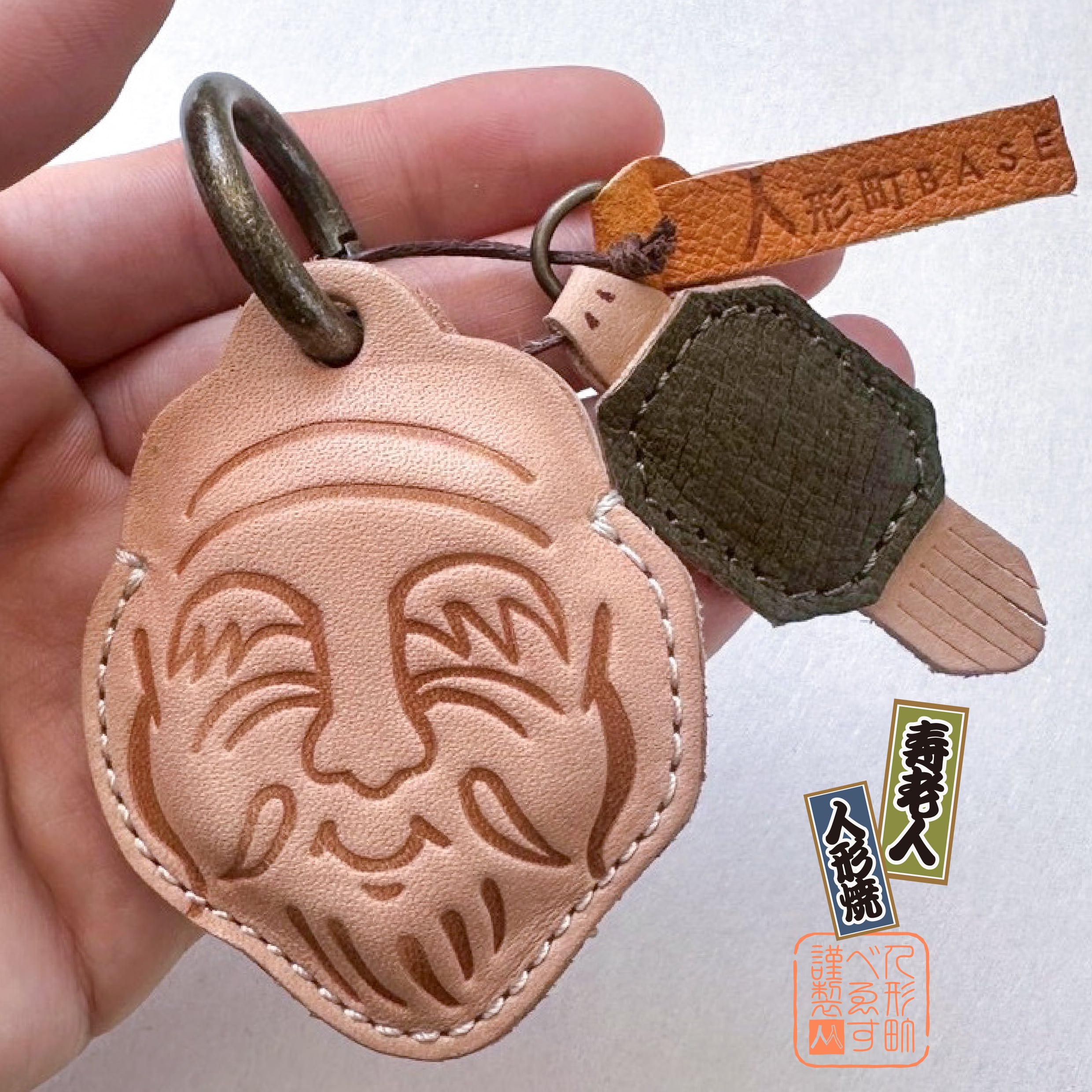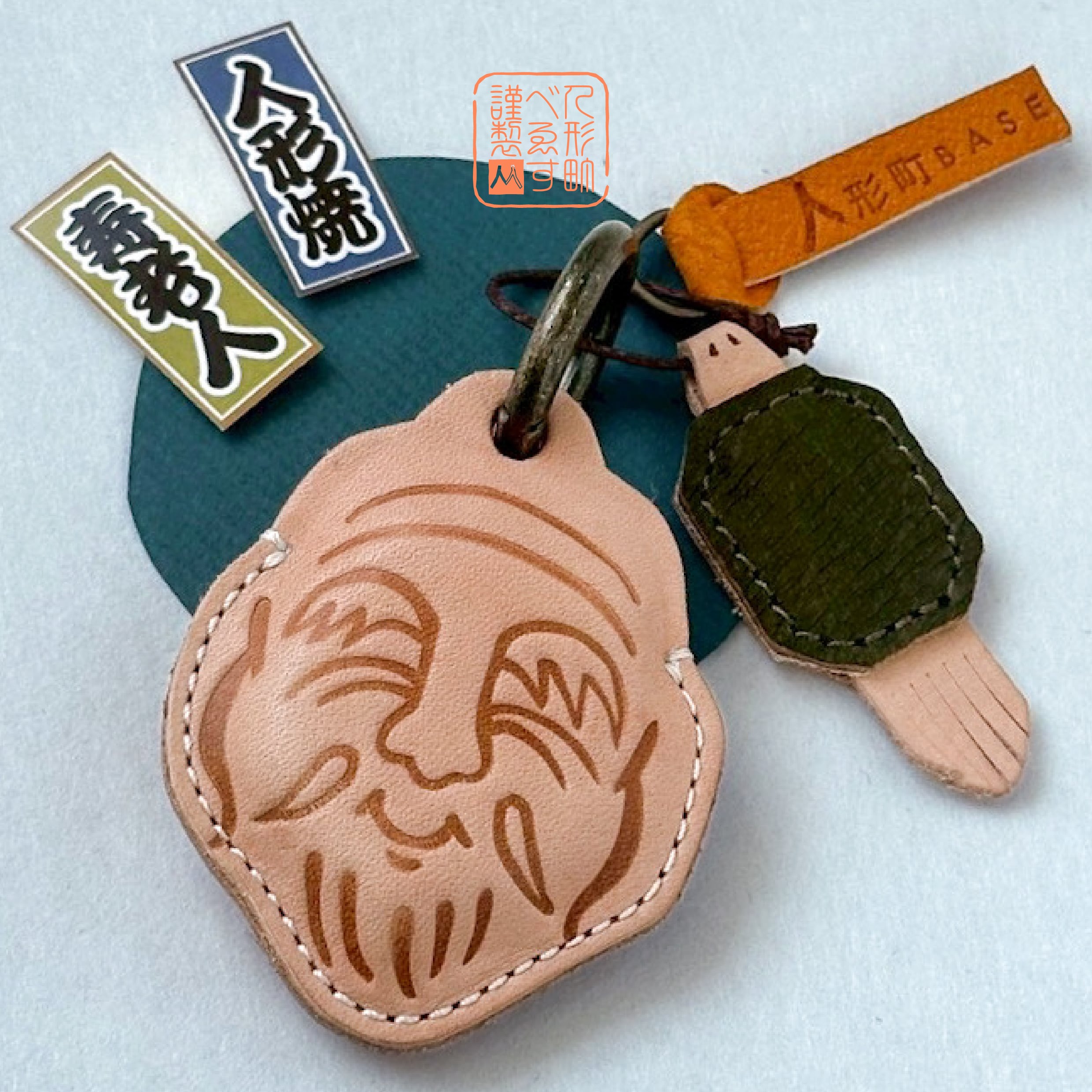 タンニン鞣しの牛革に、焼き印でお顔を一つ一つお入れし、お作りしております。