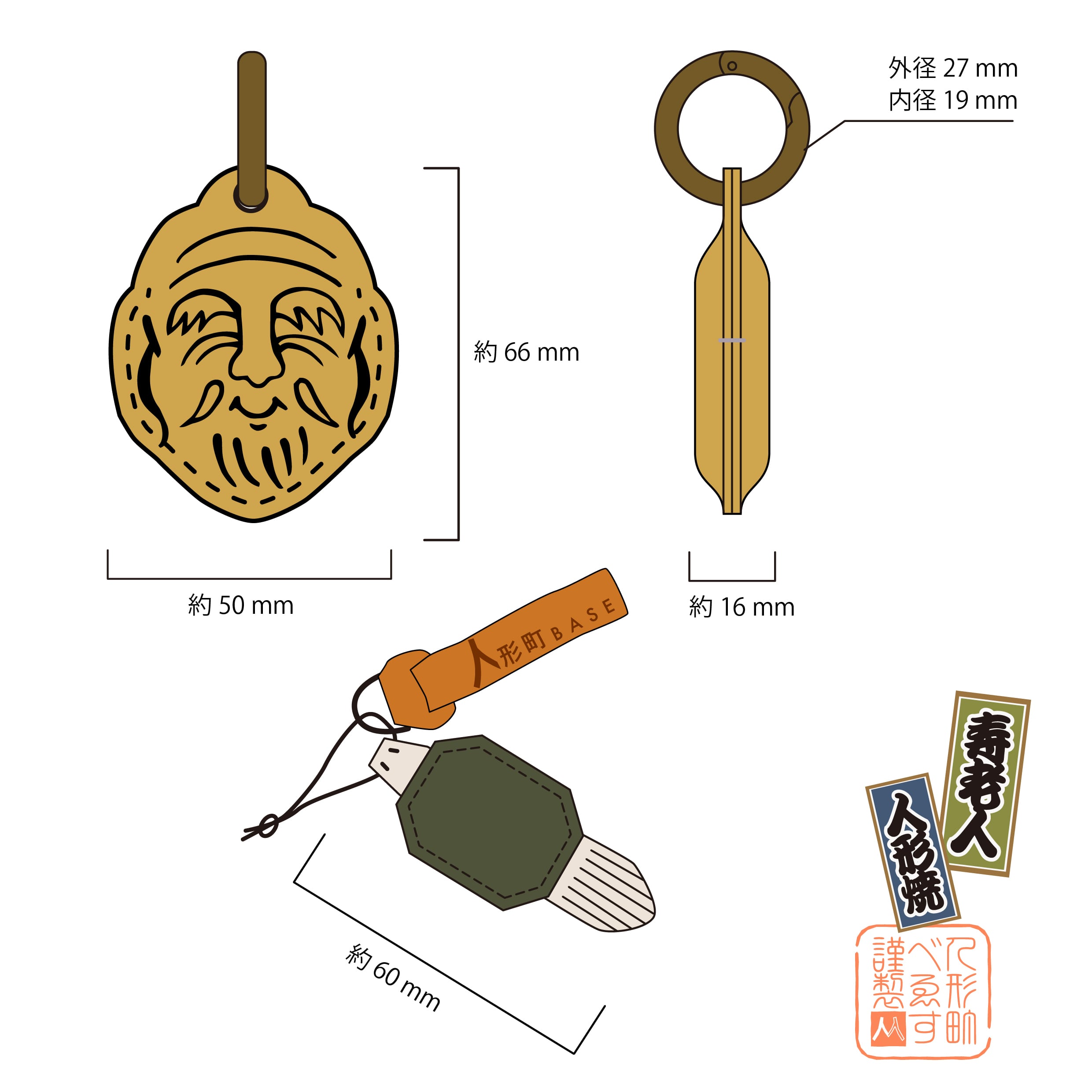 こちらは、『人形焼—寿老人』バッグチャーム本体(開閉金具付き)と